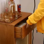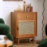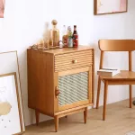 - Ample storage with a drawer and rattan cabinet