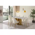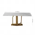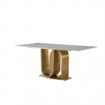 Designed with both beauty and functionality in mind, our dining table features a robust stainless steel base finished in a radiant gold that supports a sintered stone top. This top is not just a pleasure to look at but also offers unparalleled durability with its stain resistance and high-temperature threshold, ensuring that the table remains in pristine condition for years to come.