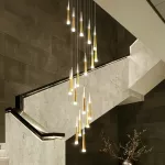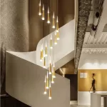 Our Modern Staircase Chandelier is a testament to the fusion of art and technology. It comes with a LED chip light source, ensuring energy efficiency and long-lasting brightness. With the capability to customize the shape and size of the chassis, the length of the hanging wire, and the number of lamp caps, this fixture is versatile to fit your specific design needs. The sturdy iron and aluminum construction, combined with a painted finish, offers durability while adding a touch of sophistication to any setting.