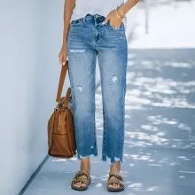 Step into the urban jungle with confidence in our latest collection of High Waist Distressed Straight-Leg Jeans. Crafted for those who dare to stand out, these jeans are a perfect blend of comfort and rugged chic. Ideal for all seasons, these versatile pants can take you from daytime errands to evening outings without missing a beat. Designed for the contemporary woman, the jeans boast a flattering high waist, a touch of stretch for comfort, and a straight leg cut that creates a timeless silhouette.