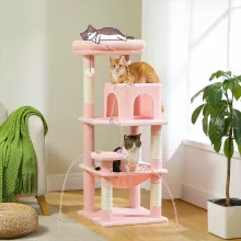 Our product stands out for its thoughtful design and superior quality. Featuring four layers of fun, it includes a cozy hammock, a private condo, a lofty tower, and multiple scratching posts. Wrapped in natural sisal and premium plush, it ensures the safety and well-being of your cats, promoting healthy nail maintenance and offering a variety of sleeping options.