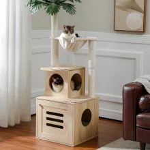 Our product stands out for its thoughtful design and superior quality. It combines a spacious cabinet large enough for a comfortable sleep or to discreetly house a litter box, a foldable litter box included for convenience, and multiple scratching posts wrapped in natural sisal rope for your cat's scratching needs. The tree also features two top options, including a coconut palm leaf top, and a variety of lounging spots like a large-space top perch and a capacious hammock. Crafted from healthy and eco-friendly materials, it ensures your cat's well-being while adding a stylish touch to your home decor.