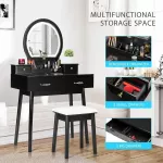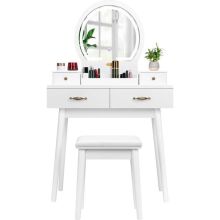 Constructed from high-quality MDF and solid pine wood legs, our vanity set is built to last. It's resistant to scratches and easy to clean, ensuring longevity and sustained beauty. The accompanying stool is padded for comfort and upholstered in a durable fabric, suitable for daily use.