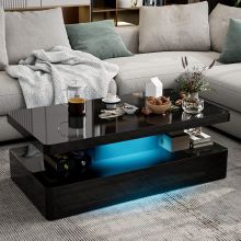 The Modern LED Coffee Table stands out with its high gloss black finish and sturdy acrylic construction, ensuring durability and a chic look. It measures 43.3 inches in width, 23.6 inches in depth, and 16.5 inches in height, providing ample surface space for your everyday needs. The table includes two smooth-gliding drawers and an open shelf, ideal for storing books, magazines, remote controls, and more.