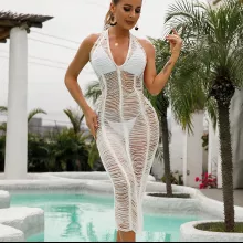 Use our battle tested marketing materials for Elegant Backless Crochet Beach Dress with Deep V Neck and Halter Design