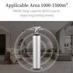This diffuser is ideal for both home and hotel environments. Whether you want to create a relaxing atmosphere in your living room or provide guests with a pleasant experience, this device is up to the task. Its large 500ML capacity means fewer refills, and with a coverage area of 1000 to 1500 cubic meters, it’s perfect for spacious rooms and common areas.
