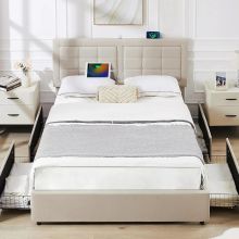 Transform your bedroom into a haven of style and functionality with our Queen Size Bed Frame featuring 4 storage drawers, a tufted upholstered headboard, and built-in charging ports. This bed frame combines modern elegance with practical features, making it the perfect addition to any contemporary home. Experience the blend of luxury and convenience that this bed frame offers, designed to provide you with the ultimate sleeping experience.