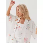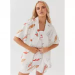 The button shirt is designed with a loose fit, short sleeves, and a front button closure, making it easy to wear and stylish. The lapel collar adds a touch of sophistication, while the playful prints keep it fun and trendy. The matching shorts feature an elastic waistband with a drawstring for a perfect fit, along with convenient pockets for added functionality.