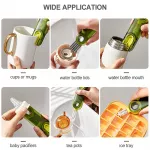 Designed for convenience, the multipurpose bottle gap cleaner brush features a hanging hole for easy storage and drying. Its 360-degree rotating brush head includes a U-shaped silicone cupping brush, a stranded slit brush, and a stiff bristle corner brush, making it perfect for cleaning bottle lids, wine glasses, tea cups, milk bottles, ice molds, peelers, and more.
