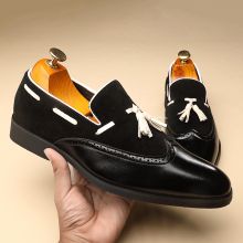 Make a bold statement with these Business Vintage Men's Mixed Color Leather Tassel Loafers. Designed for the modern gentleman with a taste for classic elegance and contemporary flair, these loafers effortlessly combine the timeless charm of brogue shoes with a fresh, vibrant mix of colors. Whether you're attending a wedding, formal event, or simply want to elevate your everyday business look, these slip-on loafers are the perfect addition to your wardrobe. Crafted with premium split leather and detailed with stylish tassels, these loafers exude sophistication. The pointed toe and brogue-inspired detailing add a refined touch, while the mixed colors provide a unique, eye-catching finish. The slip-on design ensures convenience, and the durable rubber outsole gives you the confidence to walk with ease, no matter where your day takes you.Key Features