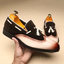 These mixed-color loafers are the perfect blend of style, comfort, and versatility. The brogue detailing and tassel accents bring a traditional elegance, while the bold mix of colors ensures you stand out in any setting. Whether you're dressing up for a wedding, a business meeting, or any formal occasion, these loafers will make sure you leave a lasting impression. The pointed toe and sleek silhouette offer a refined and modern look, making these shoes a standout addition to any wardrobe.Perfect for Weddings, Business, and Formal Events