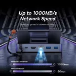 The 6-Port USB-C Docking Station comes packed with essential ports to ensure flawless connectivity. The HDMI-compatible output supports stunning 4K resolution at 60Hz, providing a crystal-clear display for gaming, streaming, and professional use. USB 3.0 ports offer lightning-fast data transfer, while the RJ45 Ethernet port ensures a stable, lag-free internet connection with Gigabit speeds. With 100W PD fast charging, keep all your devices powered and ready to go. Setup is effortless with plug-and-play functionality, allowing you to jump into action anytime and anywhere.