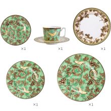 - Includes a variety of pieces: coffee cup and saucer, salad plate, dinner plate, and steak plate