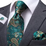 This tie set stands out due to its exceptional craftsmanship and timeless design. The luxurious silk fabric not only feels great but also drapes beautifully, ensuring you look sharp all day long. The striking dark green color, combined with the intricate paisley pattern, makes it a standout accessory that will draw compliments wherever you go. Additionally, the inclusion of a matching handkerchief and cufflinks means you have everything you need for a coordinated look, making it a fantastic gift for yourself or the special man in your life.