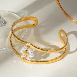 This bracelet is crafted from premium stainless steel and finished with a rich 18K gold plating, giving it a radiant shine that lasts. The open cuff design makes it easy to wear and adjustable for most wrist sizes. The anti-allergic stainless steel ensures it's safe for sensitive skin, while the waterproof and scratch-resistant features make it ideal for long-lasting wear. The imitation pearls paired with the floral motif bring a touch of vintage romance, creating a piece that feels both classic and modern.