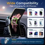 Enjoy a seamless charging experience with this 15W wireless car charger and phone holder. Designed to provide fast, efficient charging for a range of smartphones, this device combines a powerful charger with a secure, automatic phone mount. Compatible with phones from 4.7 to 6.8 inches, it features dual-coil charging technology to ensure steady, high-speed charging up to 15W. Perfect for daily commutes or road trips, this wireless charger lets you power up your device without messy cables or complicated setups.