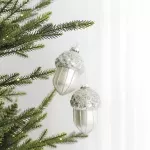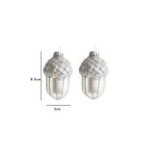Each set includes two glass acorn ornaments, each measuring 5 cm by 8.5 cm (approximately 2 inches by 3.3 inches). The acorns are beautifully finished in silver and are topped with shimmering glitter, giving them a frosted, sparkling appearance. These ornaments are made from high-quality glass, ensuring durability while maintaining their delicate and elegant look. The glitter detailing adds a touch of glamour, making them an ideal choice for hanging on your Christmas tree, displaying on your mantel, or using in tabletop decorations.
