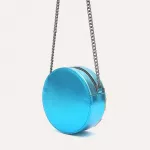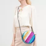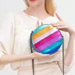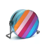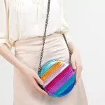 Step out in style with this unique and eye-catching round crossbody bag, designed to elevate any outfit with its bold metallic sheen and vibrant colorful stripes. Crafted from high-quality PU vegan leather, this bag offers a chic, cruelty-free option for fashion-forward individuals. Its striking design, complemented by a sleek chain strap, makes it perfect for those who love to stand out while staying organized and practical.
