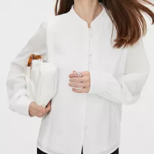 pure white blouse combines effortless style with practical design. The fake two-piece construction allows you to enjoy the layered look without the fuss, creating a sleek and polished appearance. Its