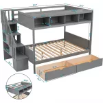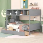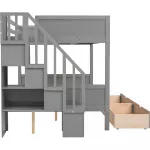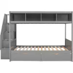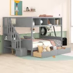 Upgrade your bedroom with this stylish twin over full bunk bed designed to combine functionality, safety, and a modern aesthetic. Ideal for families and shared rooms, this bunk bed features a twin-size upper bunk and a full-size lower bunk, offering comfortable sleeping arrangements for kids or guests. With built-in storage solutions, including a staircase with compartments, under-bed drawers, and open shelves, it’s the perfect blend of practicality and charm.
