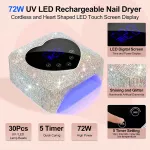 Achieve flawless, professional-quality manicures and pedicures from the comfort of your home with the Rechargeable 72W Cordless UV LED Nail Lamp. Designed for convenience, efficiency, and power, this portable nail lamp provides quick and even curing for all types of gel polishes. The heart-shaped LCD screen and sparkling rhinestone design add a stylish touch, making it the perfect addition to your beauty routine.