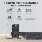 - 1200W Solar Input allows for rapid recharging from solar panels, reducing reliance on the grid.