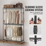 - Easy Mobility: Equipped with four 3-inch rubber casters, this rolling rack offers smooth movement across your space. Two of the casters are lockable to keep the rack stationary when needed. It’s perfect for moving between rooms or securing it in place while ironing or displaying your clothes.