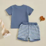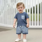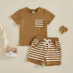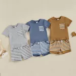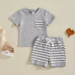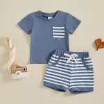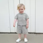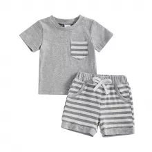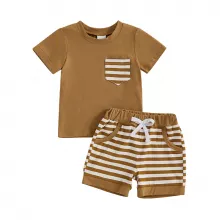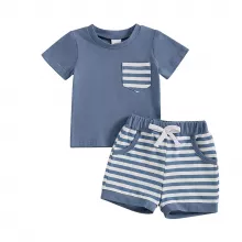 Let your little one shine in this adorable 2-piece summer outfit set, designed for baby boys who love comfort and style. This charming set includes a soft, breathable short-sleeve t-shirt with a cute striped chest pocket and a pair of matching striped shorts with a stretchy waistband for an easy, snug fit. Whether he's crawling, toddling, or taking those first steps, this outfit moves with him for all-day play. Made with a high-quality blend of 95% cotton and 5% spandex, the fabric feels gentle on delicate skin while offering just the right amount of stretch. The lightweight material makes it perfect for sunny days, whether you're at the park, having a playdate, or heading to a backyard barbecue.Product Features