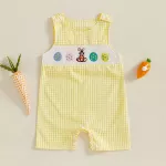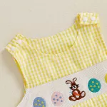 - Design: Sleeveless crewneck romper with classic plaid pattern and cute egg & bunny embroidery