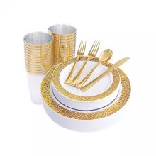 Use our battle tested marketing materials for 150-Piece Gold Plastic Dinnerware Set