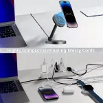 Designed with convenience and efficiency in mind, this wireless charger stand takes the hassle out of managing multiple charging cables and devices. Its powerful, magnetic charging feature ensures that your iPhone, Apple Watch, and AirPods are charged quickly and securely without the mess of wires. Whether you’re getting ready for work, winding down for the evening, or packing for a trip, this charger simplifies your life by keeping all your devices powered up in one place.
