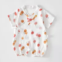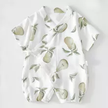 This Baby Girl Summer V-Neck Romper is the perfect blend of practicality and style. The combination of bamboo fiber and mulberry silk creates a soft, breathable fabric that ensures your baby stays comfortable no matter the weather. The V-neck design is both stylish and functional, while the single-breasted closure makes it easy for busy parents to change their little ones without hassle. Whether you're enjoying a sunny day at the park or lounging around at home, this romper provides both comfort and style for your newborn. What sets this romper apart is its gentle yet durable material. Bamboo fiber is naturally hypoallergenic, making it ideal for babies with sensitive skin. The fruit and vegetable pattern adds a charming, playful element that will brighten any day, while the light fabric helps regulate your baby’s temperature, ensuring they stay comfortable during warmer months.Perfect for Hot Summer Days