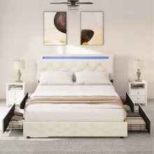 This Queen Size Bed Frame is the ideal addition for anyone looking to upgrade their bedroom with style, functionality, and comfort. The vibrant RGB LED lighting is perfect for setting a relaxing or energized mood, depending on your needs. Whether you're winding down after a long day or hosting a cozy night in, you can create the perfect ambiance every time. Thanks to the four spacious storage drawers, you'll have plenty of room to store extra blankets, seasonal clothing, or anything else that takes up precious space. The smooth glide of the drawers ensures easy access, so you can keep your bedroom neat and organized without the hassle of bulky storage furniture. The adjustable headboard, made from soft velvet, not only enhances the bed’s aesthetic but also provides comfort when sitting up in bed, perfect for reading or relaxing. It’s ideal for those who enjoy both style and functionality in their bedroom furniture. Whether you're redecorating your space or upgrading your current setup, this bed frame offers both beauty and practicality without the need for a box spring. The sturdy construction, combined with the quiet, smooth gliding drawers, guarantees that you’ll enjoy a peaceful, clutter-free environment in your bedroom.Product Benefits: