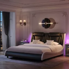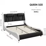Transform your bedroom into a cozy, stylish haven with this Queen Size LED Bed Frame. Featuring a sleek black and white PU leather curved upholstered platform, this bed combines modern elegance with outstanding functionality. Its adjustable 103-degree headboard ensures personalized comfort, while the two removable pillows add extra support and luxury. Whether you're lounging, reading, or drifting off to sleep, this bed provides the perfect balance of comfort and style.