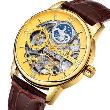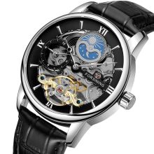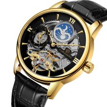 The bold 1.7-inch gold-toned alloy case frames a black skeleton dial that showcases the beauty of the automatic movement beneath. Roman numeral hour markers bring an old-world charm, while the moonphase complication adds poetic functionality, allowing you to track the lunar cycle at a glance. With no batteries required, the watch winds itself using the natural motion of your wrist.