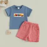 - 2-piece outfit includes: 1 embroidered car t-shirt and 1 plaid shorts