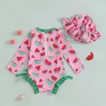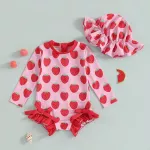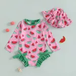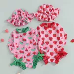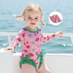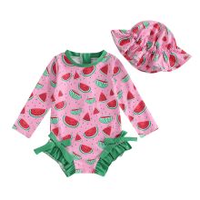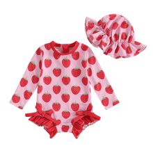 Make a splash this summer with the cutest toddler swimwear around! This long sleeve rash guard swimsuit set is perfect for your little girl’s beach days, pool parties, or sunny vacations. Designed with a sweet strawberry or watermelon print, adorable bows, and ruffle detailing, your child will stand out in style while staying protected under the sun. The included matching cap completes the look while offering extra coverage for delicate skin. Whether it’s for swimming lessons or a family getaway, this swim set combines fashion with function in the most delightful way.Product Features