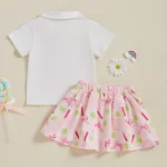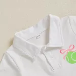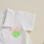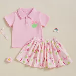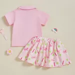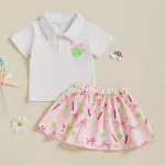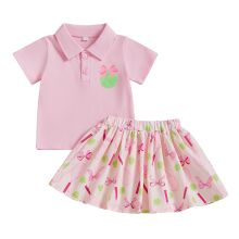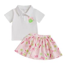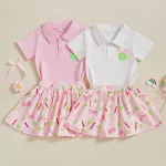 Let your little one shine with sporty charm in this adorable 2-piece toddler girl outfit, perfect for sunny days and playful moments. Featuring a short-sleeve lapel top with a sweet tennis bow print and a matching A-line mini skirt, this set brings a touch of preppy elegance to your baby girl’s wardrobe. Whether she’s heading to a birthday party, family outing, or just enjoying playtime in the park, this outfit is designed to keep her stylish and comfortable all day long. The crisp collared shirt adds a classic flair, while the flared skirt gives her room to move, twirl, and play freely. With breathable, lightweight fabric and an easy pullover design, it’s a go-to favorite for summer days and casual events. Available in soft white or pink, this set delivers a cute and coordinated look without any fuss.Product Features