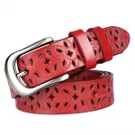 Turn heads and cinch your look with timeless style. This genuine leather women’s belt brings vintage flair and feminine detail to your outfit, all while providing the strength and durability of real cowhide. With its deep red hue and delicate hollow-out carved design, it’s the perfect accessory to dress up your jeans, skirts, or casual trousers. This is more than just a belt—it’s a bold finishing touch for your everyday look.
