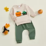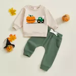 Get your little guy Halloween-ready with this charming 2-piece outfit set designed just for him. This Baby Boys Halloween Outfit features a cozy sweatshirt with an eye-catching embroidered pumpkin tractor and matching long pants — perfect for autumn adventures, playdates, or trick-or-treat fun. Made with a soft blend of cotton, polyester, and elastane, this set keeps your baby snug while allowing for comfortable movement all day long. Whether it’s his first Halloween or his third, this outfit is ideal for capturing those picture-perfect fall memories. The cute embroidered pumpkin tractor detail makes it festive and fun, while the breathable knit fabric ensures your baby stays warm without overheating. The set is available in sizes ranging from 3 months to 3 years, so every little boy can dress in seasonal style. The round neck and pullover design make dressing quick and fuss-free, and the stretchy waistband on the pants keeps things comfy even during busy crawling or toddling. Thoughtfully crafted for daily wear or special autumn occasions, this set is a must-have for your little one's fall wardrobe.Product Features