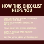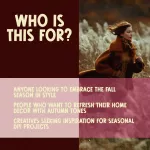 This Ultimate Autumn Colors Checklist is designed for anyone who loves the autumn season and wants to embrace its rich, vibrant hues in their daily life. Whether you’re a fashion lover, a home decor enthusiast, or a creative soul looking for inspiration, this guide will help you incorporate the cozy vibes of fall into everything you do. It’s perfect for people who enjoy DIY projects, seasonal decorating, and finding new ways to celebrate the beauty of the changing leaves.