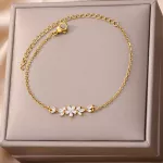 Add a touch of delicate sophistication to your look with this Elegant Gold Zircon Flower Bracelet. Designed to capture the grace of nature and the brilliance of luxury, this charm bracelet features shimmering zircon flower accents set on a gold-toned stainless steel link chain. Whether you're dressing up for a romantic evening, a formal event, or simply adding elegance to your daily wear, this bracelet effortlessly enhances your style.