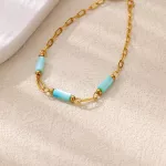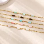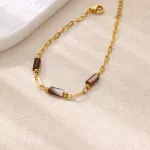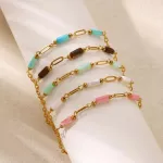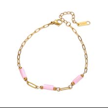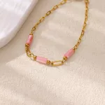 This bracelet is crafted from durable stainless steel, known for its lasting strength and resistance to tarnishing. It features a classic link chain measuring approximately 7.5 inches in length, making it suitable for most wrist sizes. Soft pink geometric beads are bezel-set into the gold-toned chain, creating a stunning contrast that’s both subtle and striking. The lobster-claw clasp ensures a secure and comfortable fit all day long.