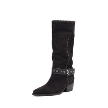 Use our battle tested marketing materials for Women's Cow Suede Mid-Calf Western Boots with Chunky Heel & Buckle Strap