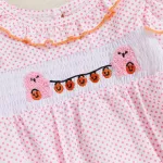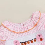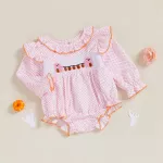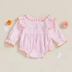 Get your little one ready for spooky season with this charming Baby Girl Halloween Romper. Featuring cute pumpkin and ghost embroidery, dot print details, and a delicate ruffled trim, this long-sleeve jumpsuit is perfect for the fall season. Made from 100% polyester, it promises a soft, comfortable fit for your baby girl as she enjoys all the Halloween fun. Whether you’re dressing her up for a Halloween photo shoot or a cozy family gathering, this romper will make her look simply adorable. The cute pumpkin and ghost design adds a playful touch, while the soft, breathable fabric ensures all-day comfort. The crew neck and long sleeves offer a snug, secure fit, making it perfect for cooler autumn days.Product Features: