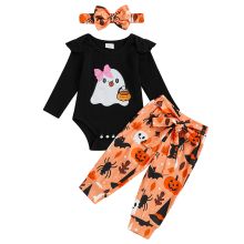 Make your baby girl the star of spooky season with this charming Halloween outfit set. Designed with a playful ghost print, this 3-piece ensemble includes a cozy long sleeve romper, matching pants with a fixed belt, and a sweet bow headband. Whether for a family photo, trick-or-treat night, or a festive fall party, this outfit is the perfect blend of comfort and cuteness.Product Features