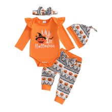 Make your little one the star of this spooky season with this 4-piece baby girl Halloween outfit. The set includes a long-sleeve letter print romper, playful pumpkin print pants, a matching headband, and a cute hat—everything you need for an easy, picture-perfect outfit. Designed with comfort and style in mind, this set is perfect for trick-or-treating, family gatherings, or simply celebrating fall in festive fashion.Product Features