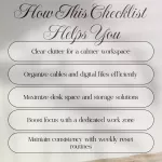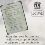 This digital download is perfect for anyone working from home, freelancers, remote employees, or students who want a more organized, functional, and inspiring workspace. Whether you’re drowning in papers, tangled cables, or browser tabs, this guide helps you regain control and sanity in your home office.Why Choose This Checklist?