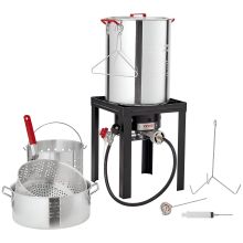 Everything you need comes in one box: a 30Qt pot, 10Qt pot, perforated baskets, thermometer, turkey rack, hanging hook, marinade injector, burner stand, LP hose, and regulator. From frying seafood to steaming vegetables or infusing flavors with the injector, this set offers endless cooking possibilities.
