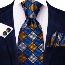 Use our battle tested marketing materials for Blue and Gold Plaid Silk Tie Set with Handkerchief and Cufflinks